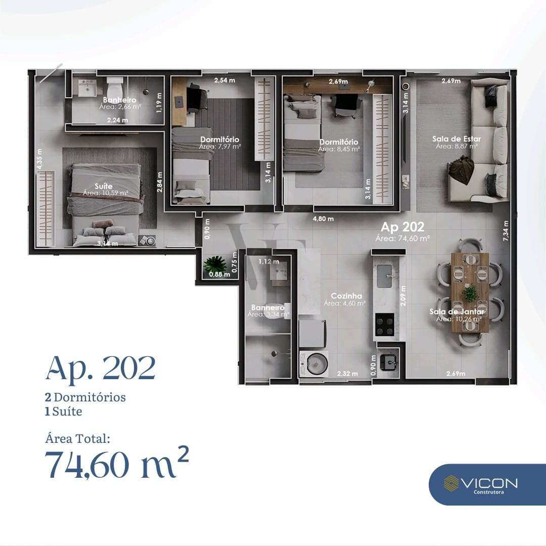 Área Total: 74,6m²